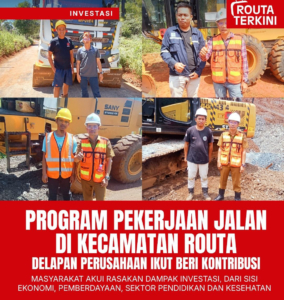 Konawe, AspirasiRakyat.Pro – Program perbaikan infrastruktur jalan sepanjang kurang lebih 45 kilometer di Kecamatan Routa mulai menunjukkan dampak nyata bagi masyarakat, setelah pemerintah Desa Lalomerui bersama sedikitnya delapan perusahaan yang beroperasi di Kecamatan Routa terlibat dalam pembangunan jalan yang digagas Pemerintah Desa Lalomerui ini dengan target menghubungkan jalan dari Desa Lalomerui hingga Kelurahan Routa. Selain pembangunan jalan itu, Masyarakat setempat juga merasakan manfaat atas kehadiran investasi didaerah mereka, diantaranya hadirnya program layanan kesehatan gratis, pemberdayaan Bumdes sebagai penyalur hasil pertanian warga yang dipasarkan ke areal Perusahaan tambang, penyerapan tenaga kerja lokal, serta Pembangunan infrastruktur Sarana Pendidikan, Bantuan Beasiswa, dan sejumlah manfaat lainnya yang diungkapkan oleh Kepala Desa Lalomerui, Taksir Unggahi saat wawacarai Awak Media, pada Jum’at 10/04/2026.